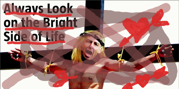 Треба да пее „секогаш гледај кон светлата страна на животот“. Но, зошто вика така? Затоа што е таен францисканец и одбива да ја испие горчливата чаша. Со ниво на алкохол во крвта од 1,4 и два џоинта хашиш, Клинсман би се соочил со својата судбина многу помирно. Небесното зголемување на анусот. од Сатирикон.